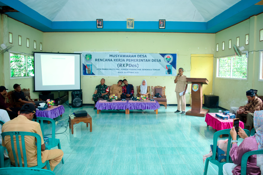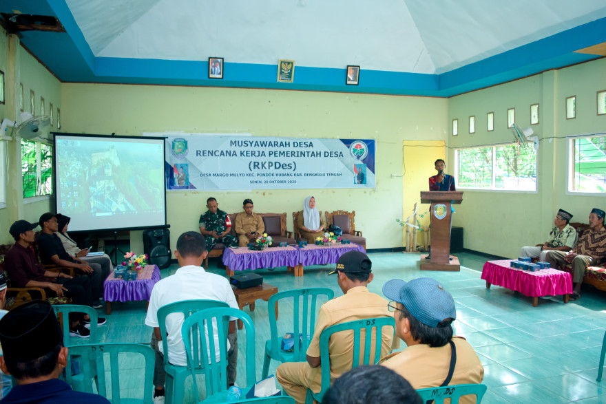 Desa Margo Mulyo, Bengkulu Tengah — Senin, 20 Oktober 2025, Pemerintah Desa Margo Mulyo, Kecamatan Pondok Kubang, Kabupaten Bengkulu Tengah, menggelar Musyawarah Desa (Musdes) dalam rangka penyusunan Rencana Kerja Pemerintah Desa (RKPDes) Tahun Anggaran 2026, bertempat di Balai Desa Margo Mulyo pada Senin (20/10/2025). Kegiatan ini merupakan tahapan penting dalam proses perencanaan pembangunan desa sebagaimana diamanatkan dalam Undang-Undang Nomor 6 Tahun 2014 tentang Desa. Musdes ini bertujuan untuk menampung, menyeleksi, dan menyepakati berbagai usulan kegiatan pembangunan yang akan dilaksanakan pada tahun mendatang, berdasarkan hasil musyawarah tingkat dusun dan prioritas kebutuhan masyarakat. Musyawarah Desa dihadiri oleh berbagai unsur pemerintahan dan masyarakat, di antaranya: